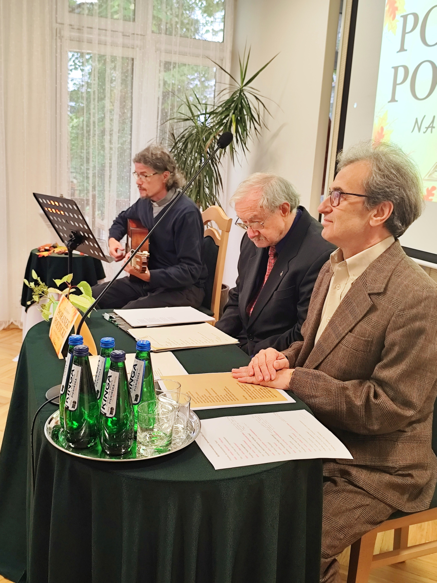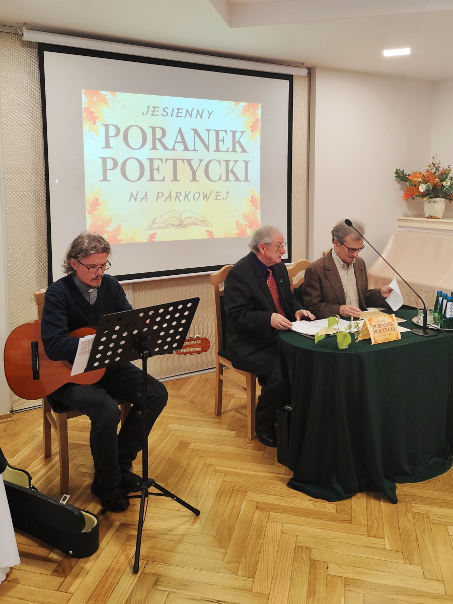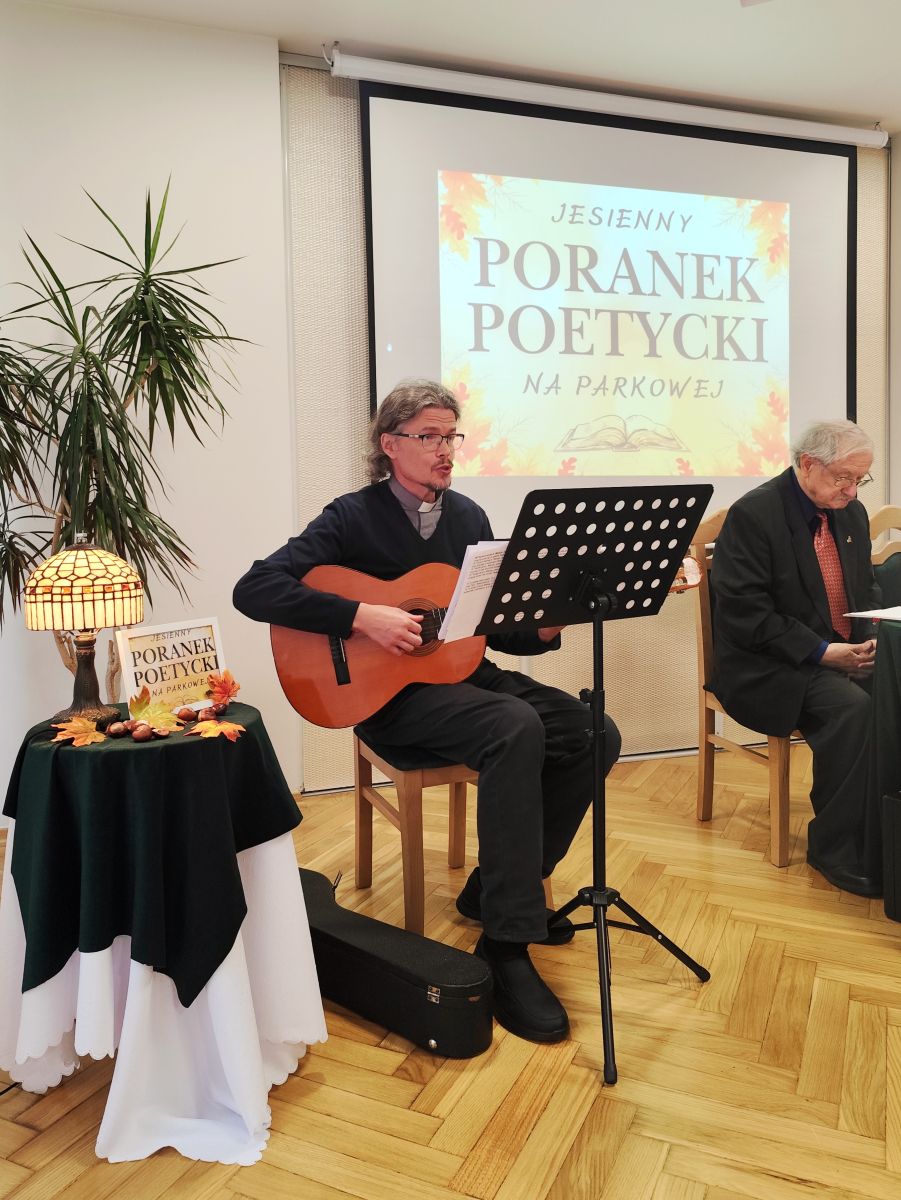 W naszym Domu 30 września 2025 r. odbył się "Jesienny Poranek Poetycki na Parkowej". Ponownie inicjatorką spotkania była Pani Dyrektor Barbara Nowikow, która przez wiele lat była Dyrektorem naszego DPS. Pani Dyrektor jako Pomysłodawczyni kolejnego spotkania z poezją trafiła w gusta naszych Mieszkańców. Poeta Pan Karol Bek, ksiądz Tomasz Bek oraz Pan Mirosław Kominek po raz kolejny przeniesli nas w krainę łagodności. W świat poezji czytanej i śpiewanej, tym razem w jesiennej aranżacji. Przesłaniem Autorów były takie wartości jak dobro, nadzieja, miłość, wiara, radość, uśmiech, przemijanie oraz wdzięczność za piękno naszej przyrody. Dziękujemy za dar serca, wspólną obecność i mile spędzony czas.