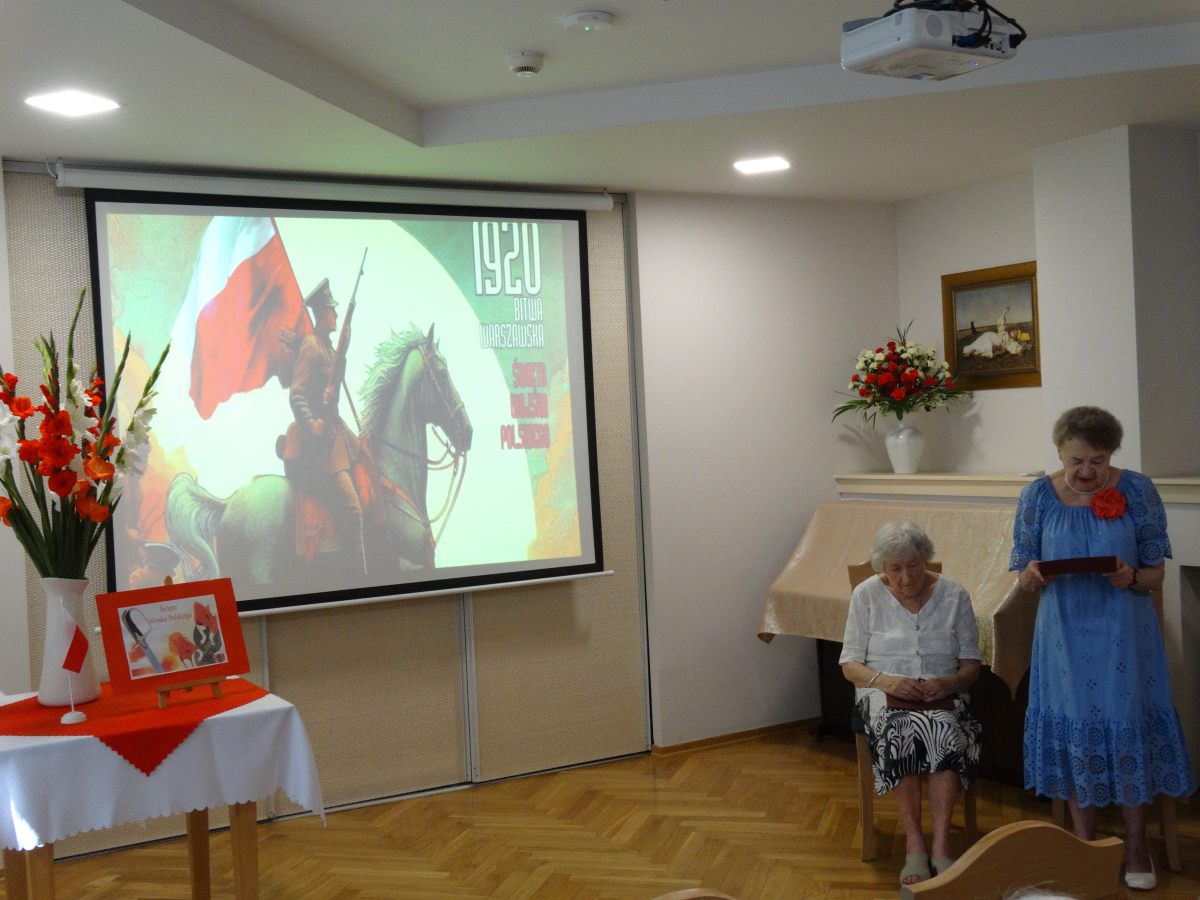 15 sierpnia na pamiątkę zwycięskiej Bitwy Warszawskiej w 1920 roku obchodziliśmy Święto Wojska Polskiego. Oddaliśmy cześć i hołd pamięci żołnierzom poległym w walkach o wolność Ojczyzny. Oglądaliśmy film edukacyjny o wydarzeniach tamtej wojny. Nasze Mieszkanki ze wzruszeniem recytowały wiersze patriotyczne. Nie zabrakło wspólnie śpiewanych znanych piosenek wojskowych. Uroczysty nastrój spotkania dopełniły dekoracje w narodowych biało-czerwonych barwach.